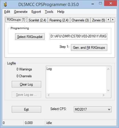 main-window, in the order of a normal programming flow - 1. RX-Groups, 2. ScanList/Roaming (generate empty lists), 3. Write channels, 4. Scanlist/Roaming (fill lists with channels), 5. Zones (generate and fill zones) AR685/PD785: - Added exporting RXGroups; AR685/PD785 allows up to 64 TGs per group - Added export of zones with more than 16 channels; Now up to 256 channels per zone are supported - Bugfix: Writing of zones with more than 16 channels, sometimes stopped at 16 channels, depending on CPS speed. This is fixed now. |